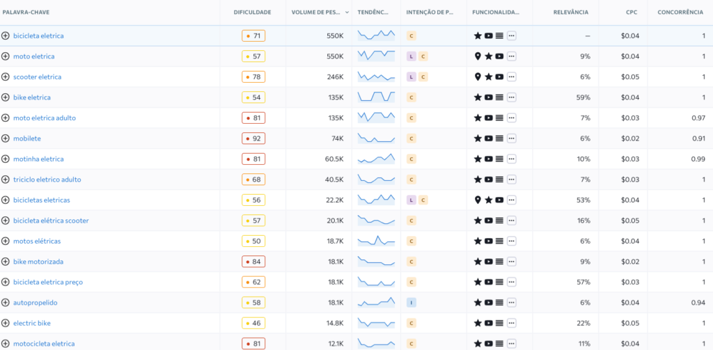 A análise de palavras-chave (feita com a ferramenta SE Ranking) relacionadas ao termo “bicicleta elétrica” mostra que as buscas estão fortemente ligadas à jornada de compra, o principal indicador dessa característica é a intenção de compra comercial (na tabela abaixo, sinalizada com um “C” na coluna intenção de pesquisa), dos termos.