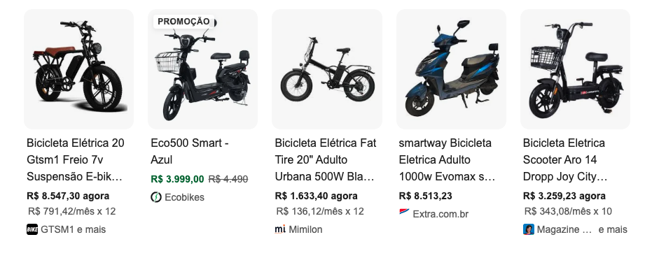 Além dos marketplaces, a SERP traz em sua maioria e-commerces focados em mobilidade elétrica e bicicletas.