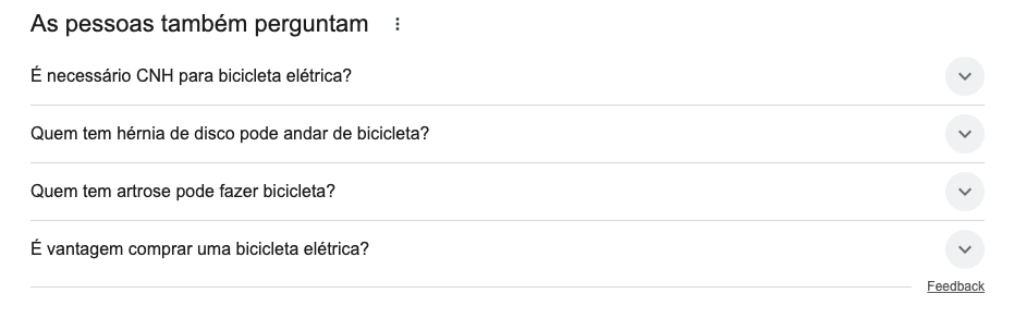 Essas pesquisas indicam consumidores que estão avaliando o investimento para adquirir uma bicicleta elétrica e variações do próprio produto.
