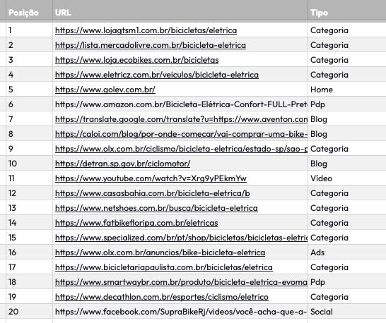 Esse mesmo estudo foi feito em agosto de 2024 e a SERP no Top 10 para o mesmo termo “bicicleta elétrica”, todas as páginas mudaram de posição e poucas marcas continuam no Top 10.