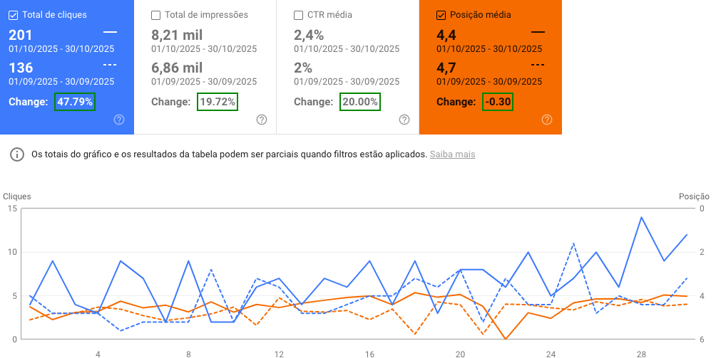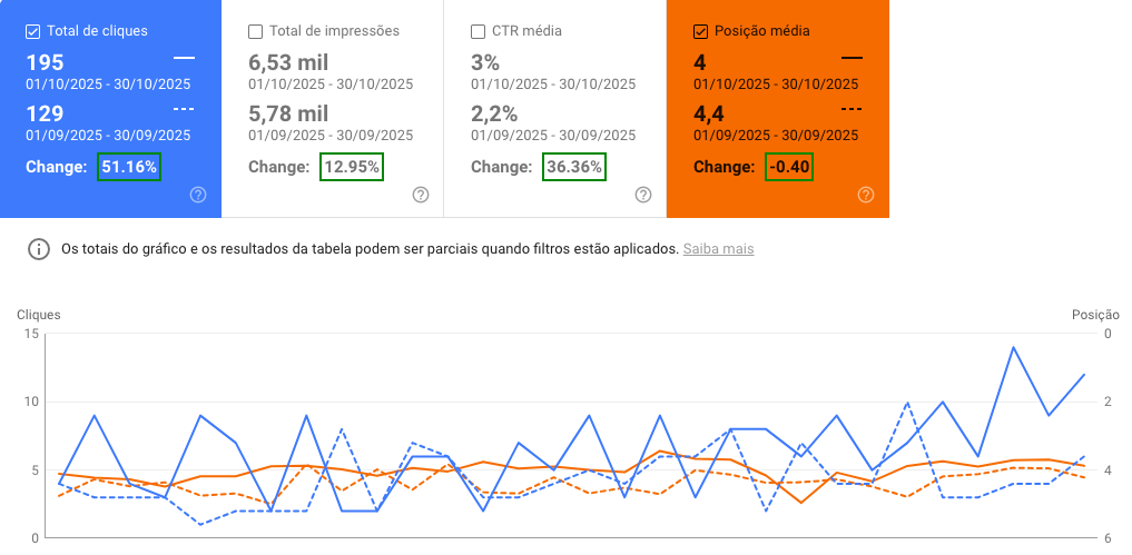 Melhora de relevância para o algoritmo: Otimizando títulos, descrições e conteúdos, conseguimos colocar palavras‑chave nos locais estratégicos (H1, H2, âncoras e URL). Isso aumentou a relevância das páginas e ajudou nas posições.