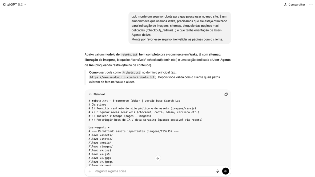 O ChatGPT é capaz de gerar uma estrutura básica de robots.txt, além de fornecer uma explicação básica de como preencher e o que cada linha faz. Bem legal, não é?