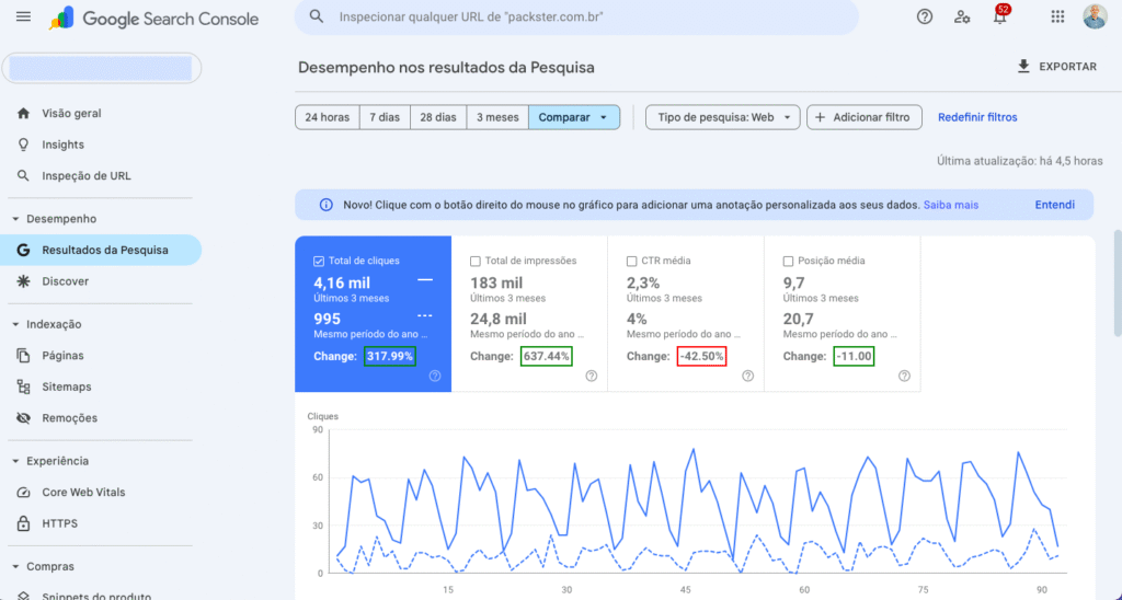 - Cálculo automático de percentuais: exibe a variação de cliques, impressões, CTR e posição diretamente nos relatórios.