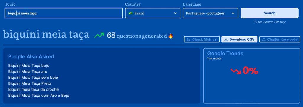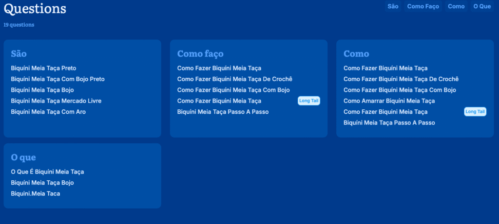 - Gerador de perguntas e long‑tails: extrai dados de autocomplete, People Also Ask e outras fontes para mostrar o que as pessoas realmente perguntam.