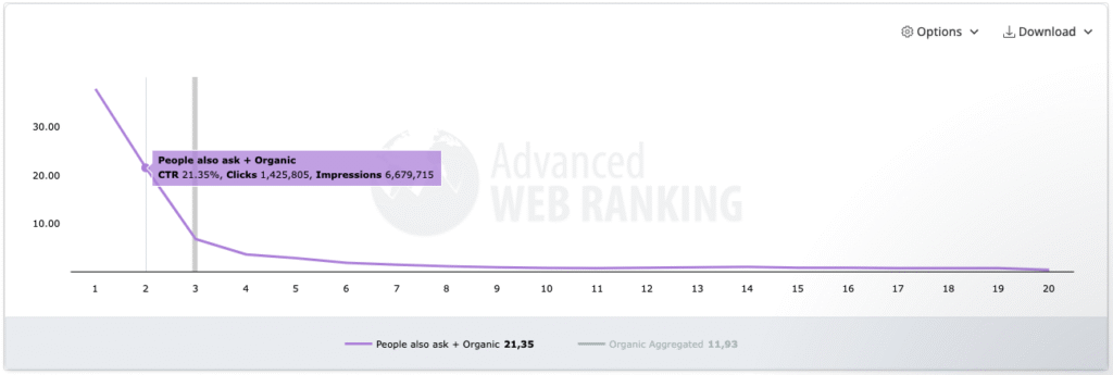 Este recurso da AWR monta curvas de CTR segmentadas por posição e pela presença de SERP features. Ele coleta dados de milhões de consultas e atualiza mensalmente, ajudando a responder perguntas como “quanto tráfego ganho se subir da 8ª para a 4ª posição?”. Use para: